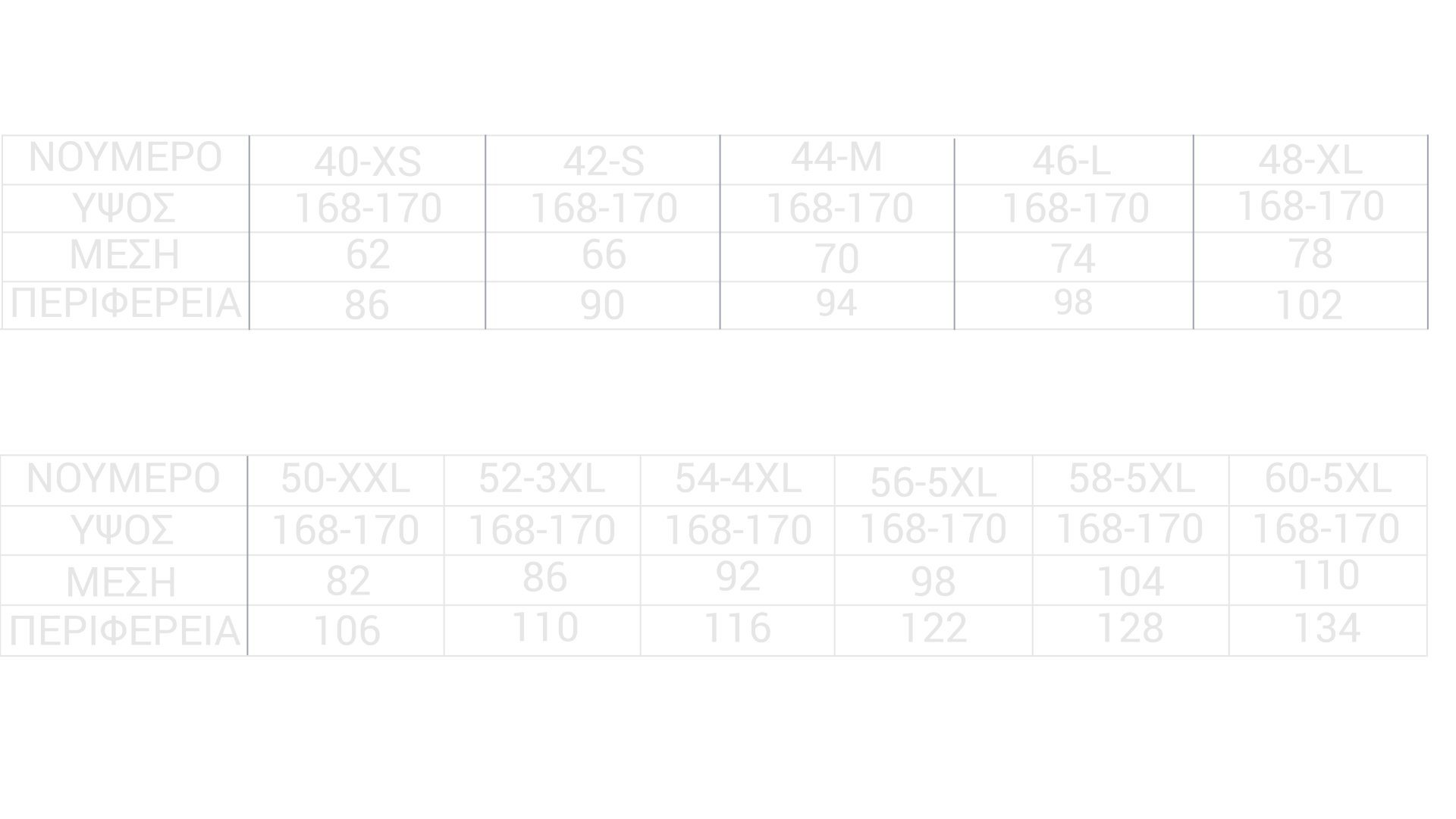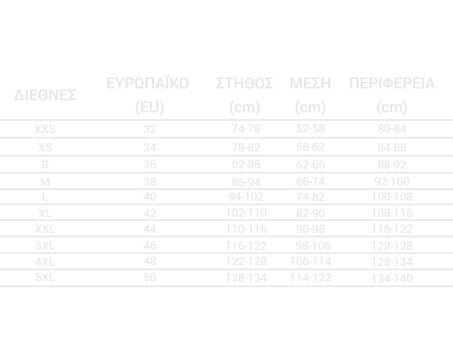 Τα μεγέθη μπορεί να διαφέρουν ανάλογα με την εταιρεία ένδυσης, αλλά μπορείτε να χρησιμοποιήσετε τις παρακάτω μετρήσεις σαν οδηγό.