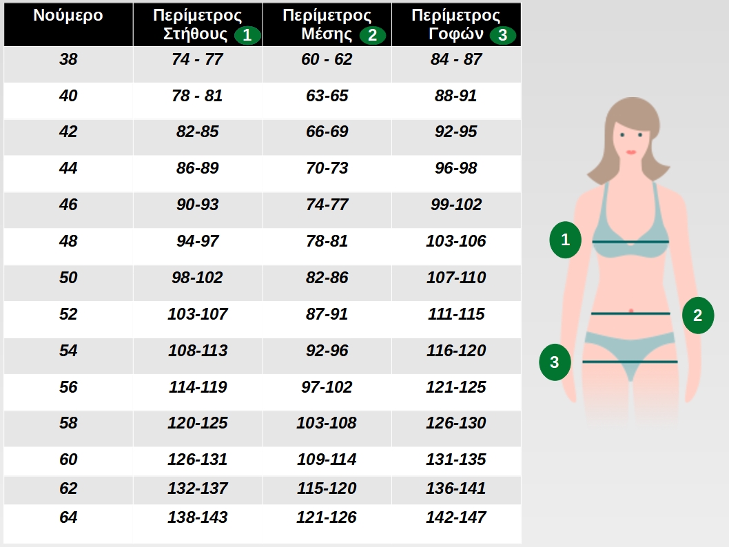 Σας συμβουλεύουμε: Αν οι μετρήσεις π.χ ( περίμετρος στήθους ) σας οδηγούν σε μέγεθος 78 - 81, να επιλέξετε ένα νούμερο μεγαλύτερο ( δηλαδή αντί για νούμερο 40 να επιλέξετε νούμερο 42 ).
